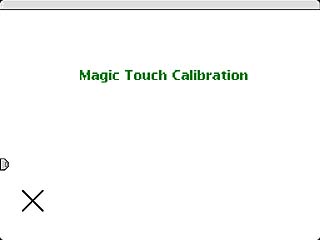 MagicTouch Util が起動すると画面全体が白くなり、左下に大きな×印が表示 される(図4)。この×の位置を指などで触ると、次に画面中央に×印が表示される。 これに触れると最後に右上に×印が現れる。右上の×印に触れると位置合わせは 終了する。